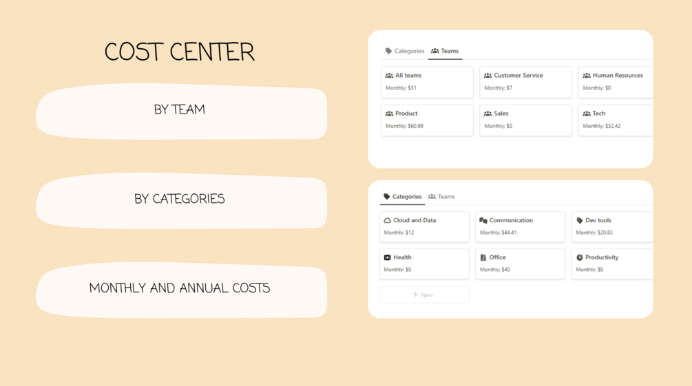 - Cost Centers: Organize your expenses by team and categories, discovering savings and efficiency opportunities.