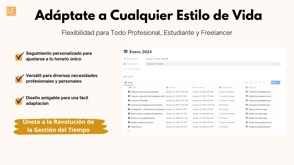 Time Tracker es más que una simple plantilla de Notion; es tu asistente personal para la gestión del tiempo. Diseñada meticulosamente para profesionales, freelancers, estudiantes y cualquier persona que busque eficiencia en su rutina diaria.